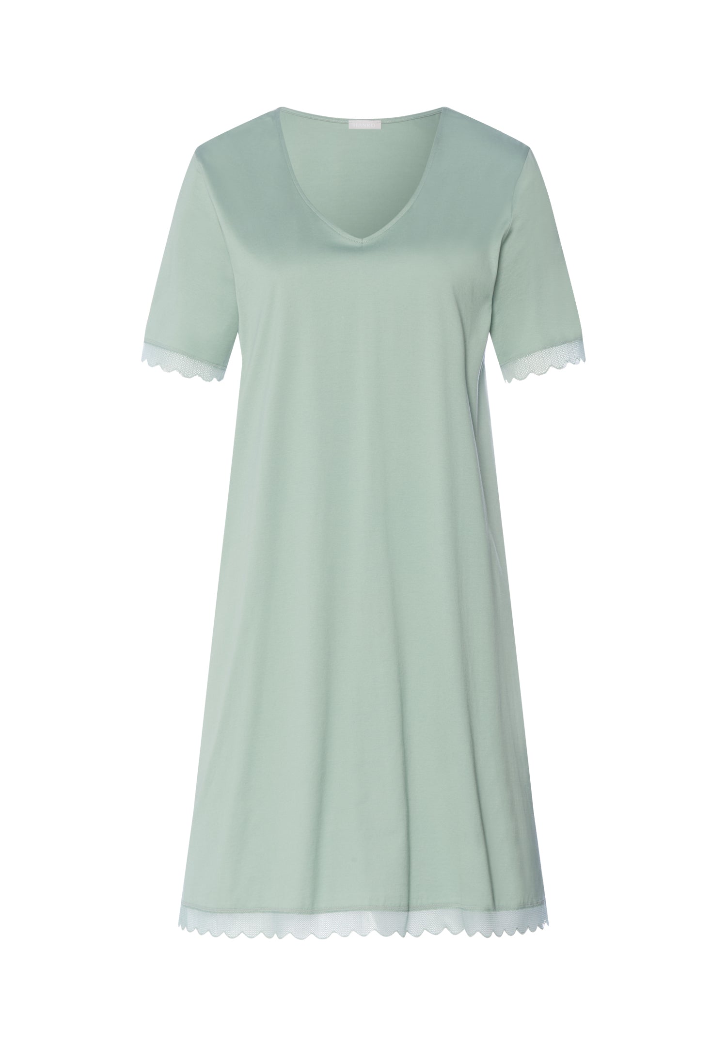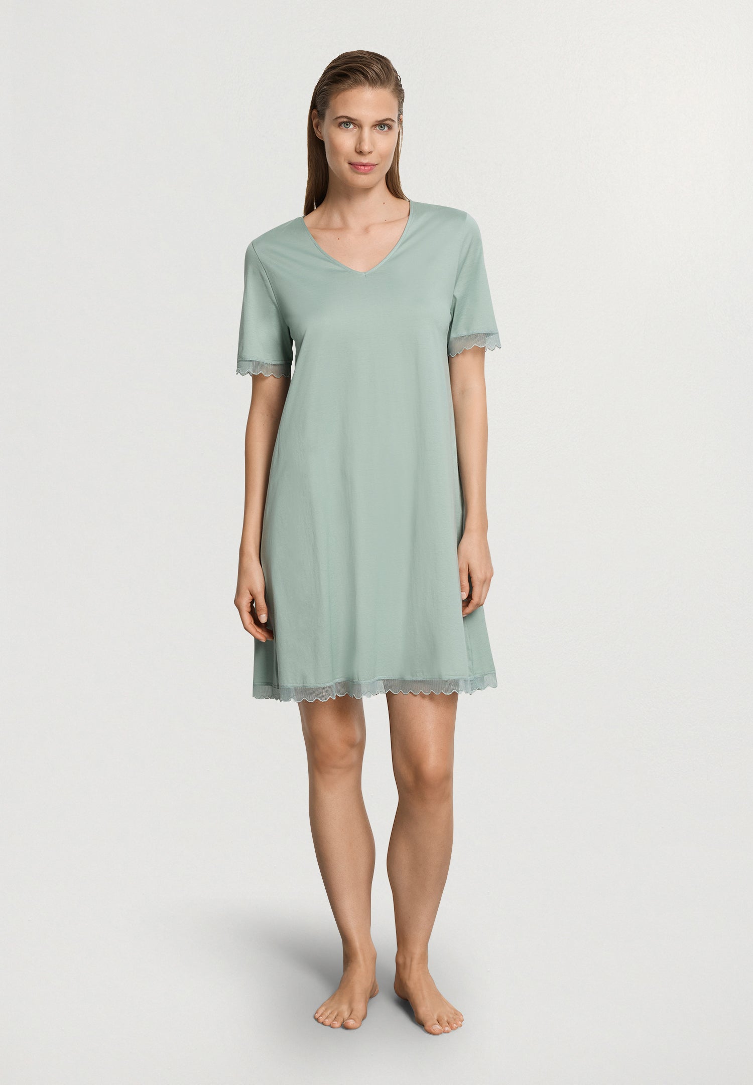 The best way to relax after a demanding day is in this feel-good nightgown made from 100% extra-soft US Pima cotton. This nightgown is naturally breathable made with long-staple cotton and therefore retains its shape, is low-pilling and very tear-resistant. Thanks to the mercerization process at our in-house production facility in Austria, the fabric has a sensual shimmer and a soft-to-the-touch feel. The flowing design with a V-neck is adorned at the hem and short sleeves with color-coordinated, semi-transparent MADE IN ITALY tulle lace in a scalloped look.