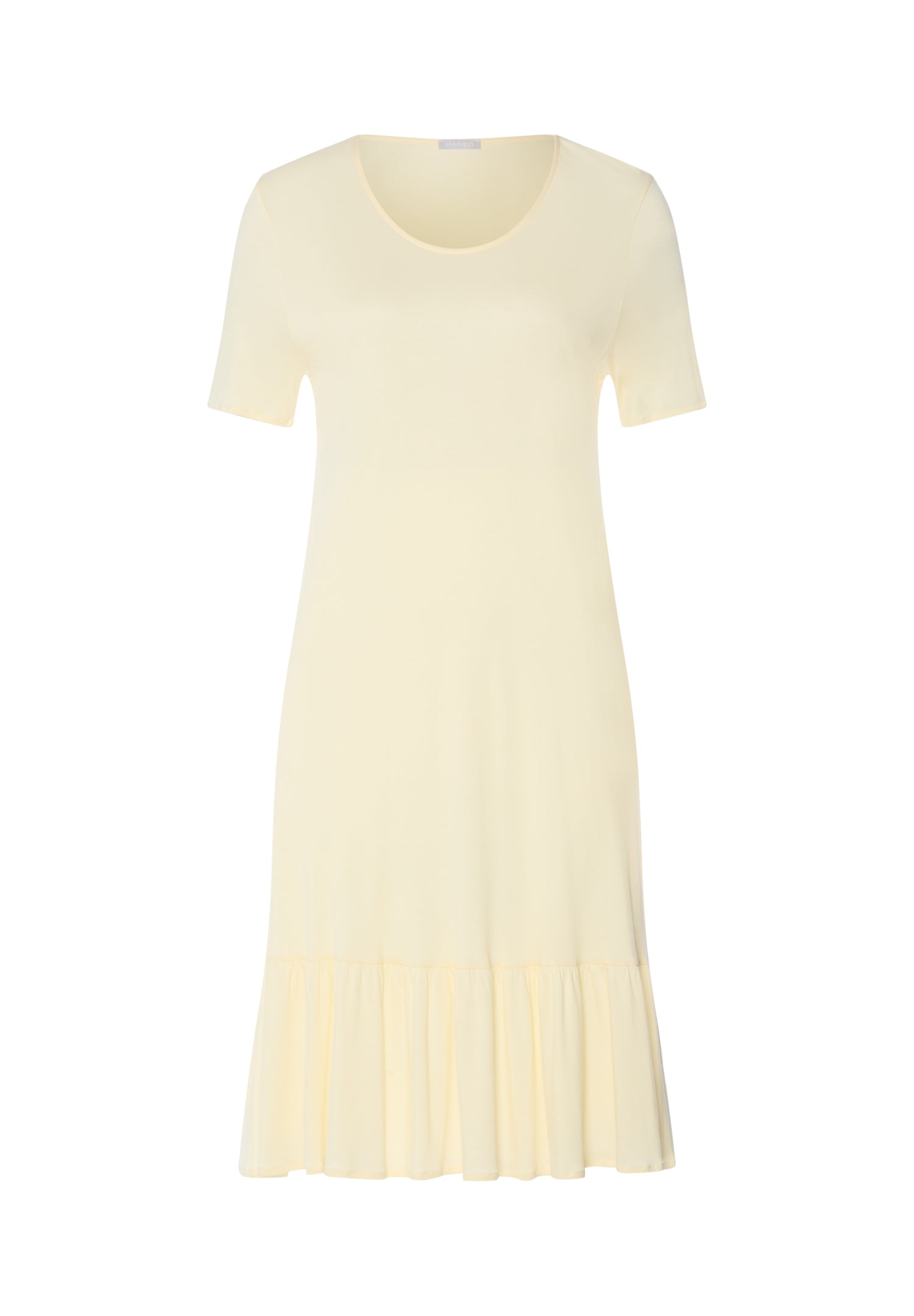 This elegant crew neck nightgown with short sleeves and a feminine, knee-length flounce hem is perfect for summer. The soft, flowing TENCEL™ Micromodal is known for its good moisture regulation in warm weather and the long-lasting suppleness of the material. This high-quality fabric is produced in-house in Austria and is made from wood-based cellulose fiber. The comfortable nightgown is also perfect as an uncomplicated travel outfit, for a walk on the beach or a little refreshment at the hotel bar.