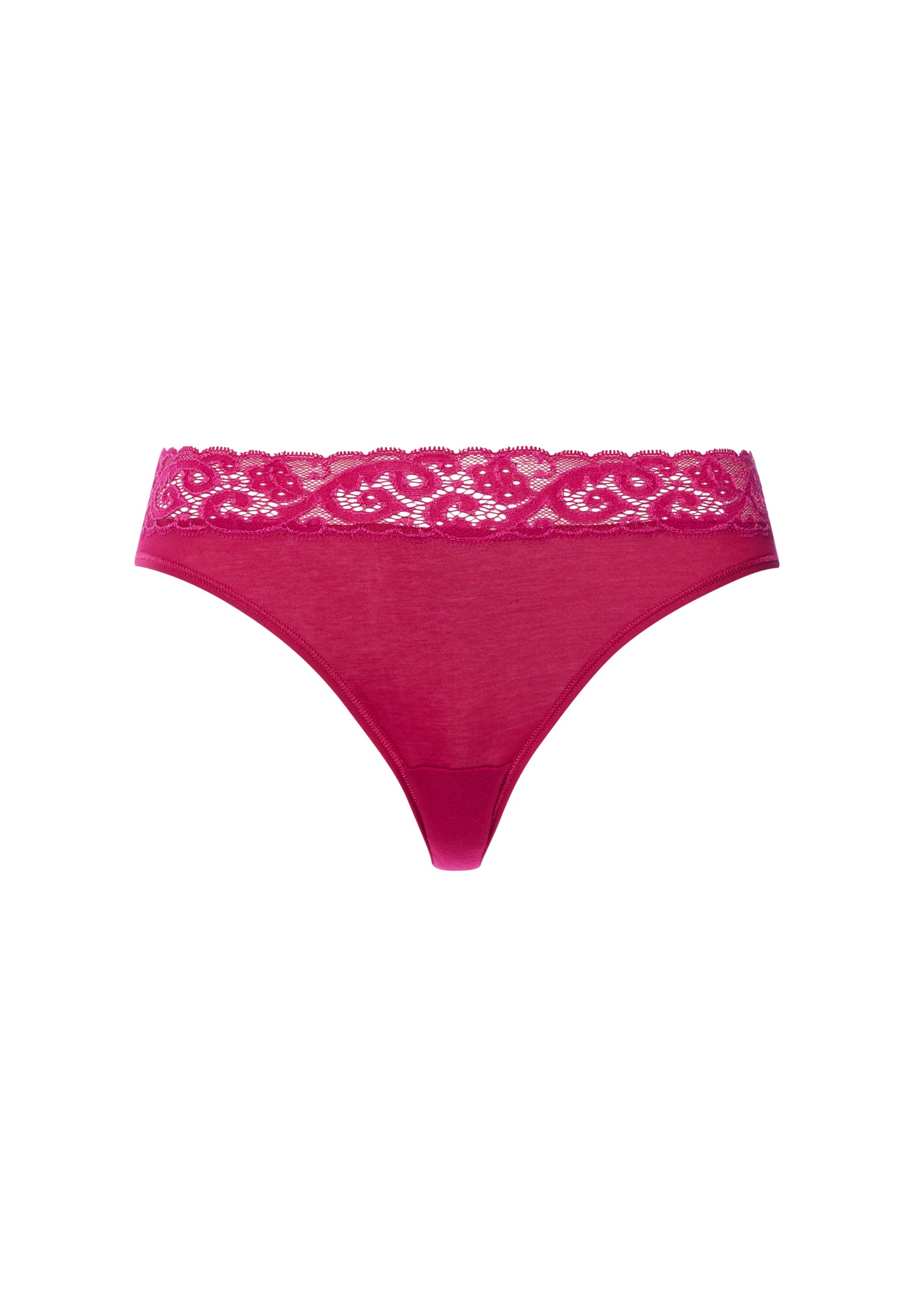 - Lace-trimmed, high cut brief panty; elegant and sleek with seamless sides
