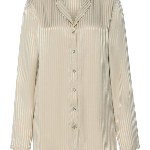 This big shirt, made of 100% soft jacquard viscose, can be worn on its own or with matching pants while you sleep. The alternating matte and shiny stripes are woven directly into the naturally breathable fabric, creating a timelessly elegant look. The wide blouse picks up on classic shirt design elements such as a full-length button placket and a lapel collar. The long-sleeved shirt works equally well as a boyfriend-style nightshirt or styled casually with jeans. This versatile garment is particularly popular on holiday and when traveling.