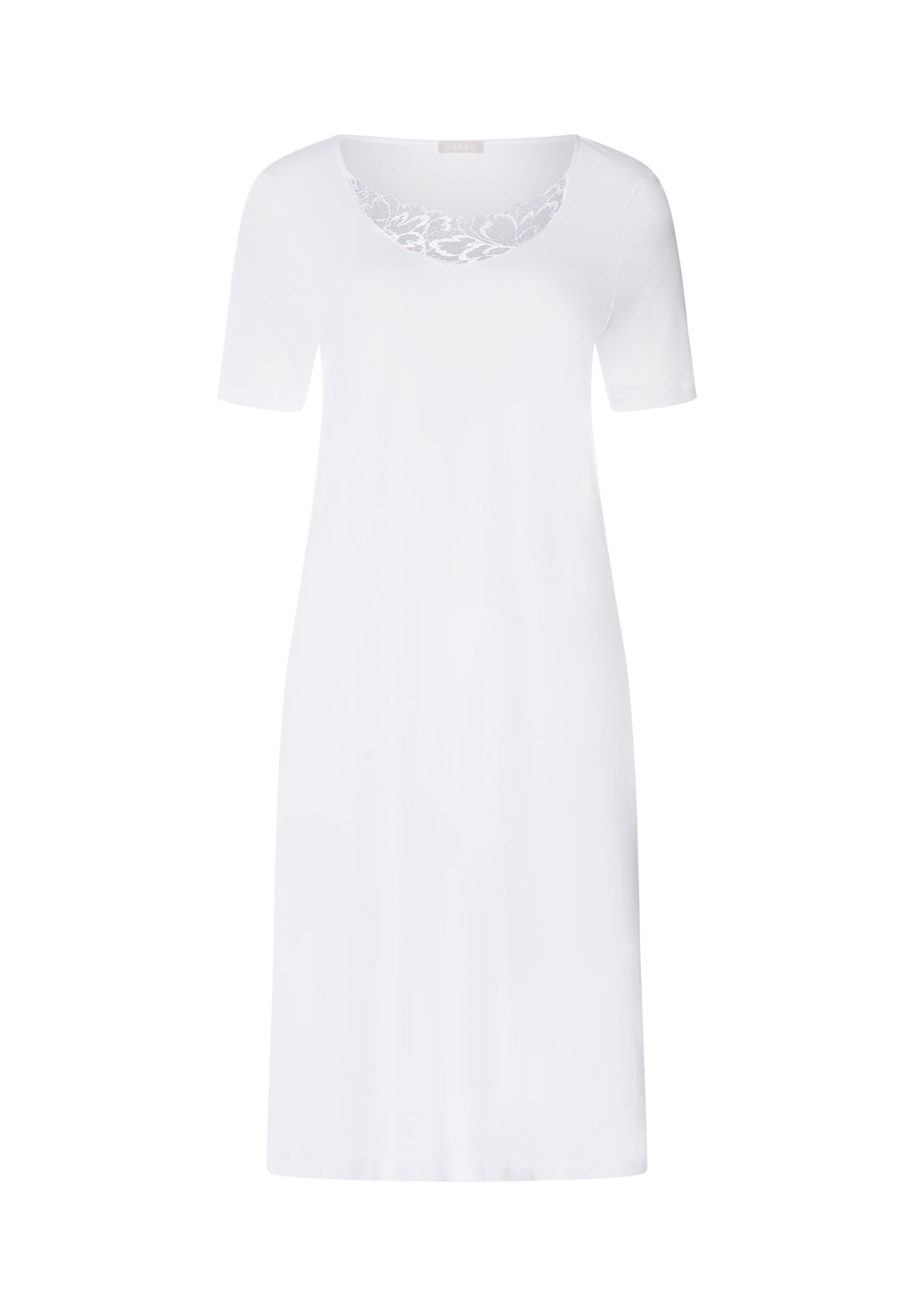 On warm summer nights, it's perfect to sleep in this short-sleeve nightgown with an embroidered motif along the neckline. The tulle-based floral embroidery, designed exclusively for HANRO by our design team, is made in Austria and adorns the décolleté with its romantic necklace shape. The subtly shimmering fabric made from 100% mercerized cotton is also manufactured in-house. The soft, flowing interlock of this short nightgown is characterized by its unparalleled moisture management, especially in summer, and is easy to care for and durable.