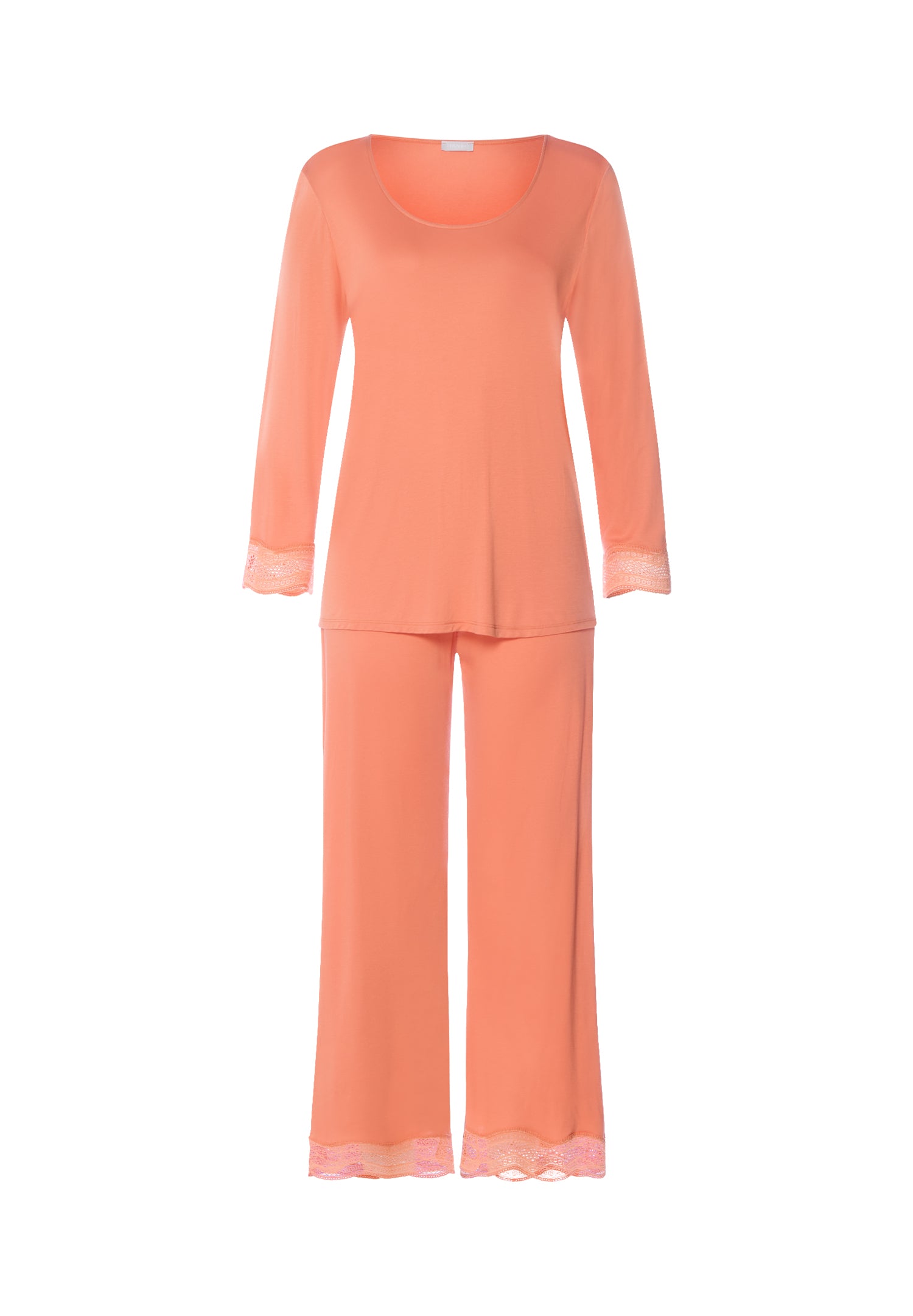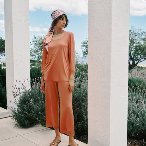 These loose, airy pajamas in a fashionable 7/8 length are the summer pajamas for wonderfully relaxed nights. The scalloped tulle lace on both the sleeves and pant legs gives the pajama set with crew neck an elegant, semi-transparent look. The seductive jacquardtronic lace is elastic and feels soft against the skin. The interlock made of 100% TENCEL™ Micromodal feels super soft and provides excellent moisture management. The flowing fabric comes from responsible wood sources and is made right here in Austria.