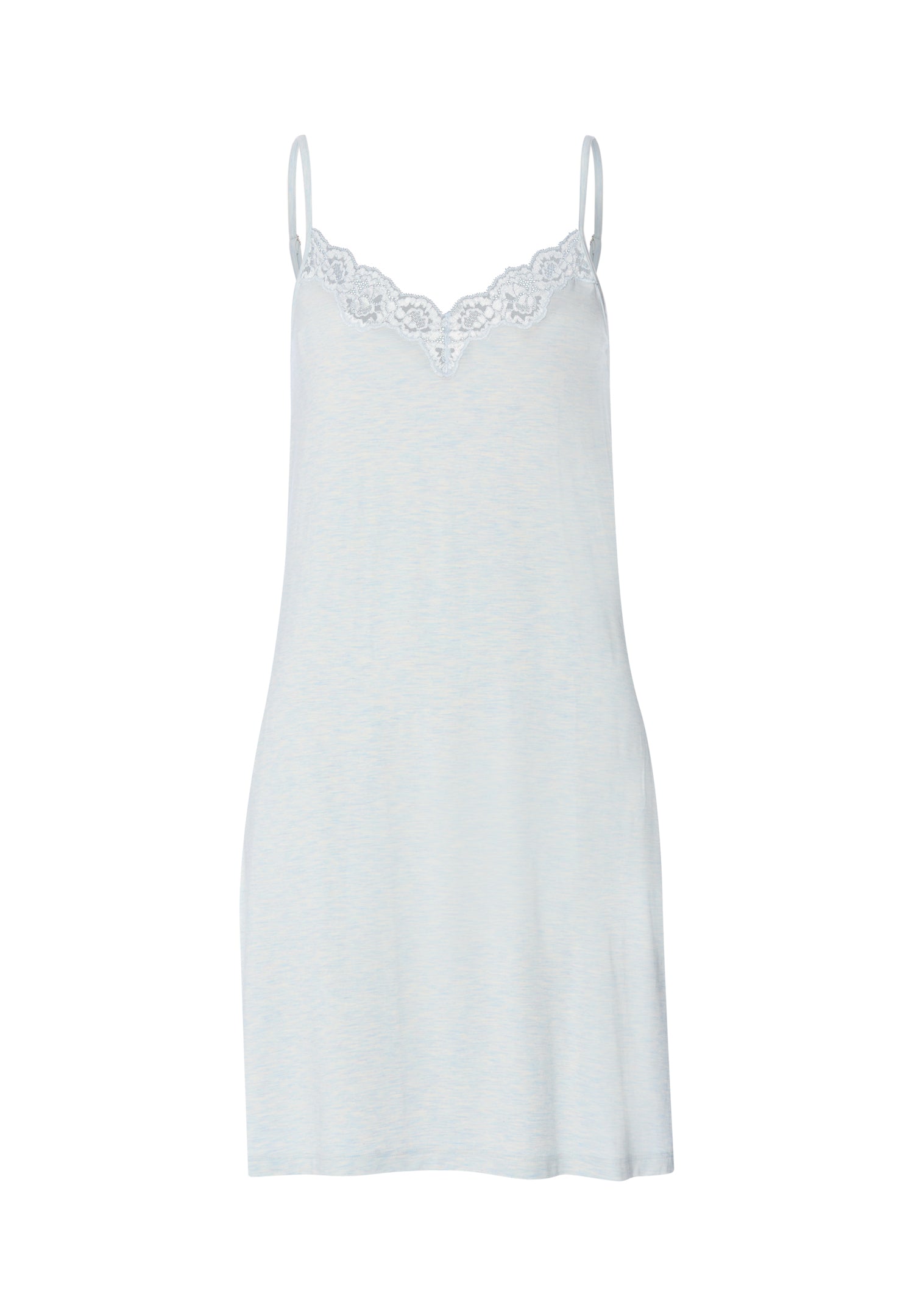 Natural Elegance, clean nightwear made from a soft, flowing mélange viscose fabric that feels wonderful on the skin. The collection features modern, casual cuts and sophisticated design details. The chemise features scalloped lace along the neckline and has adjustable straps for the perfect fit.