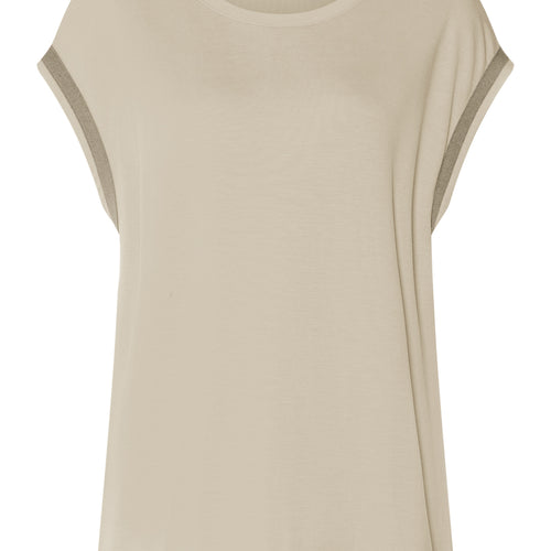 This feminine tank top with slightly oversized shoulders is ideal for traveling or working from home. The short sleeves and hem are adorned with sewn-on decorative trim in a light, contrasting color. The soft, breathable material made from a sustainable TENCEL™ Lyocell blend is particularly popular in summer, as the fibers naturally minimize odors. Thanks to its good moisture management, the skin-friendly interlock ensures a dry feel in warm weather. For a solid-colored look, shorts and pants are available in the same design.
